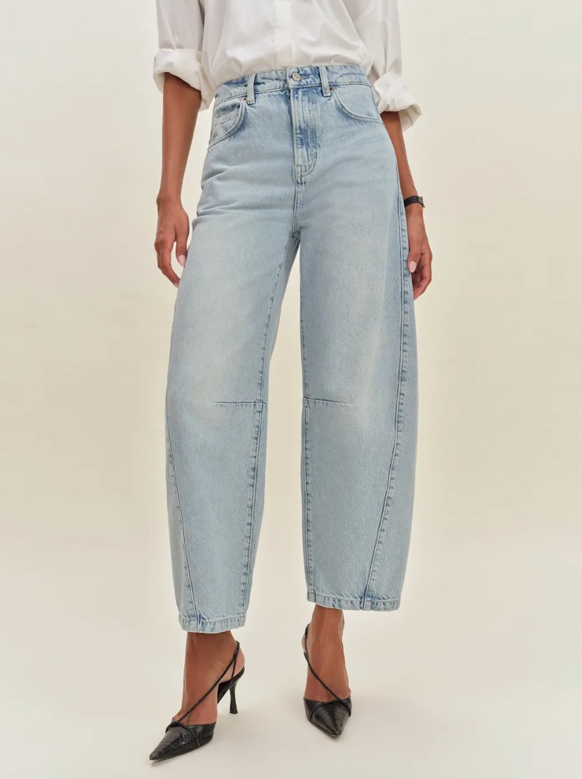 Agolde is a denim label first, so you know there’s a lot of thought and intentionality behind all of their jeans. Their goal is to focus on design, comfort, and sustainability, and they personally test every fit and fabric. Agolde has two barrel jeans designs, both a simple yet classic take on the pants. The Luna High Rise Pieced Taper barrel jeans are high-waisted with a full-length leg and made from a mix of regenerative cotton, post-consumer recycled cotton, and recycled lyocell. The Low Curve Jeans are a more subtle barrel jean, with a mid-rise waist and a relaxed fit. These are made from 100% regenerative cotton for a more rigid material.
