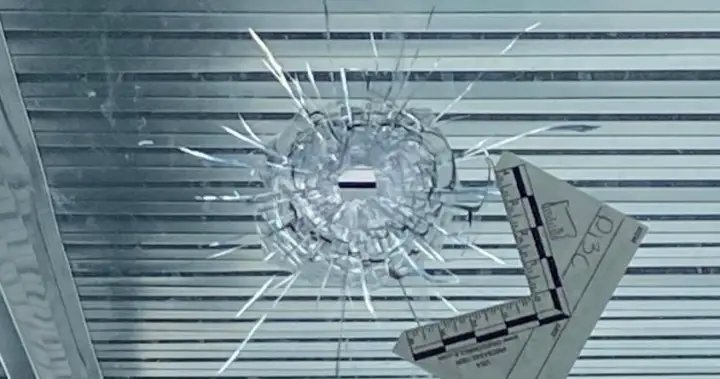 Bullet hole in glass which Dharmjit Mand said was part of an extortion attempt against him.