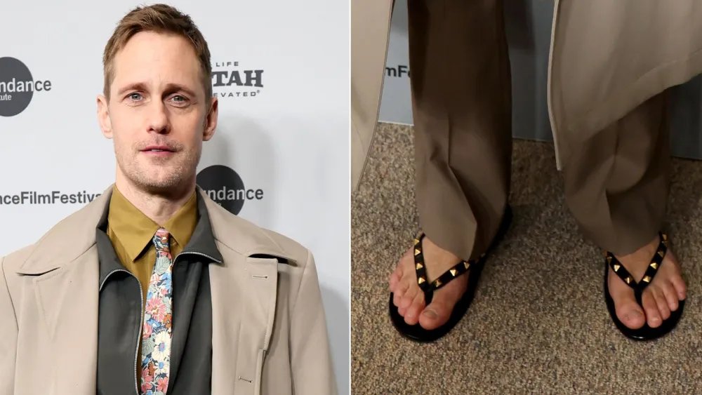 Alexander Skarsgård revived the luxury flip-flop debate at Sundance on Friday, wearing a pair of Valentino Rockstud thong sandals to the premiere of “The Moment” during the 2026 Sundance Film Festival in Park City, Utah.