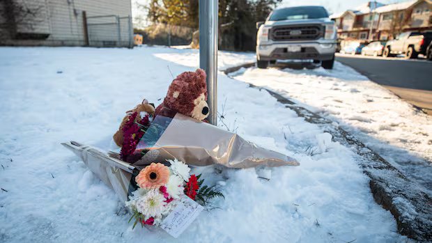 The site of the fatal police shooting, near 185 Street and 70 Avenue in Surrey, is photographed on Feb. 10, 2025 — one day after it happened. (Ben Nelms/CBC)