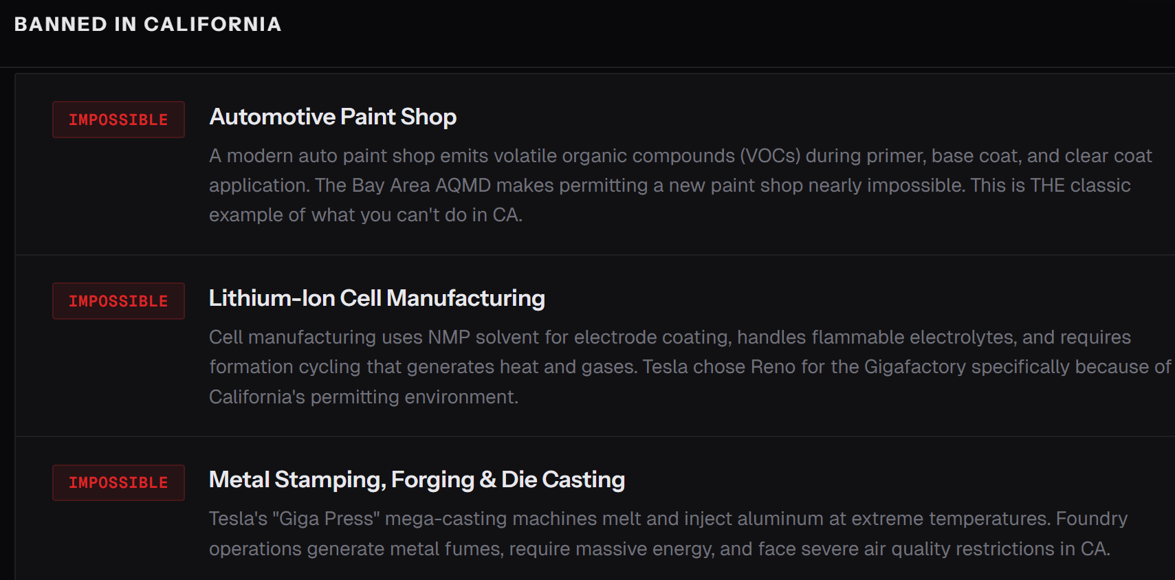 California cannot permit the construction of a smartphone factory, an electric car plant, or a Navy destroyer shipyard. Not won’t — can’t. The regulatory environment makes it effectively impossible to build new semiconductor fabs, automotive paint shops, battery gigafactories, or steel foundries.
