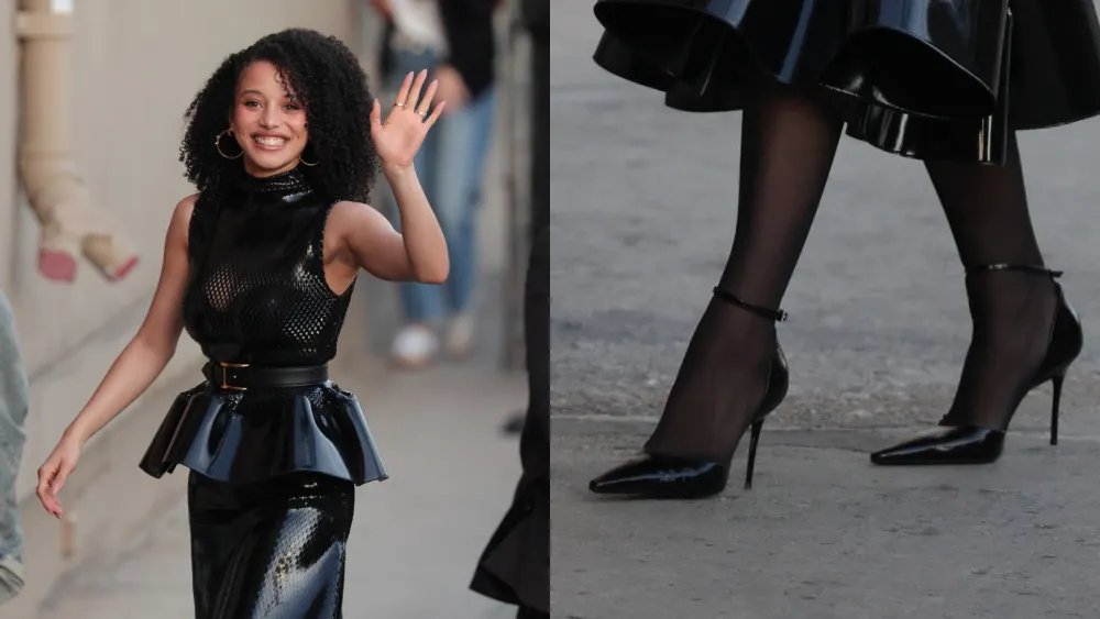 The shoes completed an outfit from the winter-spring 2026 Archetypes Collection by Pieter Mulier. The look included a shiny black perforated peplum top and skirt, both of which flared out at the bottom. The sleeveless top featured a high neck and was cinched by a black belt, and the skirt was midi length. As for the rest of her look, the 25-year-old actress wore her curly hair out and accessorized with hoop earrings.