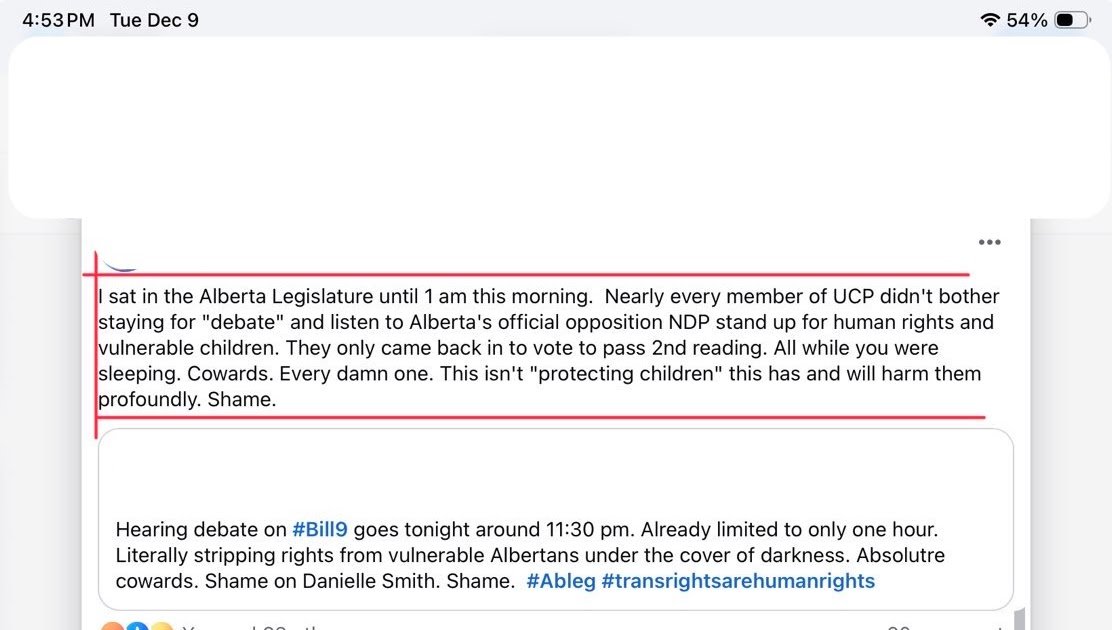 First, it is beyond appalling to me that a government passing legislation which arbitrarily revokes rights guaranteed under The Charter cannot even be bothered to be present in the legislature during time allocated to debate.  All but a couple of UCP MLAs left the Chamber until the vote.  At this point, this isn’t a debate, it’s theatre.  The UCP is at best going through the “procedural motions” (don’t get me started on the use of time allocation to limit debate), while it slams through some of the most serious legislation a government can execute.
