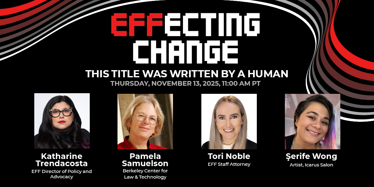 Join EFF Director of Policy and Advocacy Katharine Trendacosta, EFF Staff Attorney Tori Noble, Berkeley Center for Law & Technology Co-Director Pam Samuelson, and Icarus Salon Artist Şerife Wong for a live discussion with Q&A.
