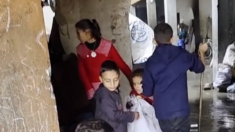 Torrential rain has turned Gaza’s tent cities into rivers, killed at least a dozen people and washed away hopes that a ceasefire that has lasted two months would substantially improve the quality of life for millions of displaced people. Among those who have died is an 8-month-old baby girl. NBC News’ Matt Bradley reports.