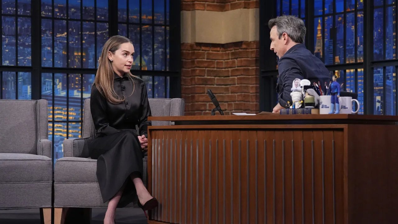 Emilia Clarke this week on Late Night With Seth Myers. Image credit: Lloyd Bishop/NBC via Getty Images.