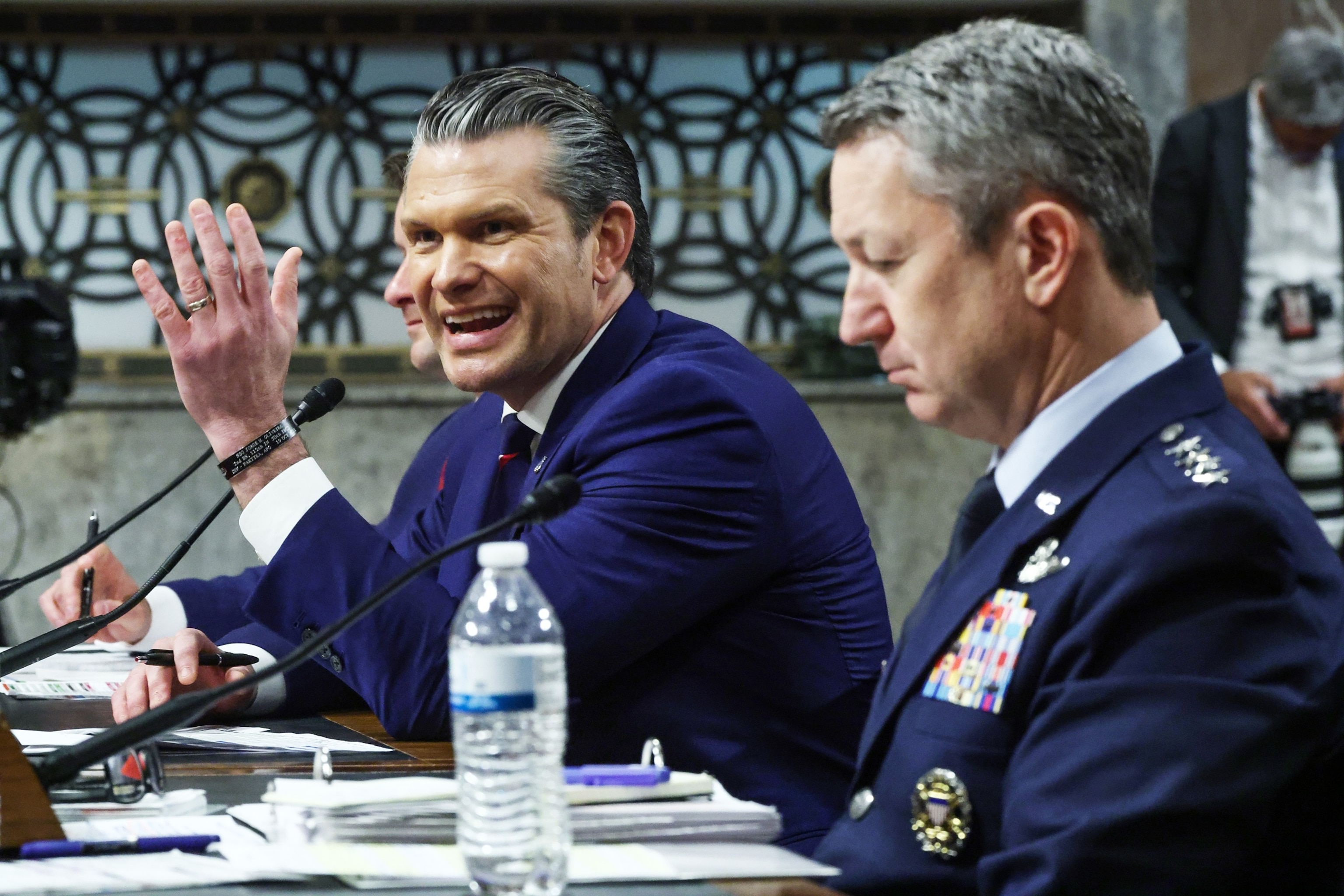 “Defeatists from the cheap seats who, two months in, seek to undermine the incredible efforts that have been undertaken and the historic nature of taking on a 47-year threat,” Hegseth said in his opening statement.