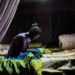 Residents Tiffany English and Mya Carpenter, 6, fill sand bags for their neighbours in Minden, Ont., on Thursday, April 16, 2026.