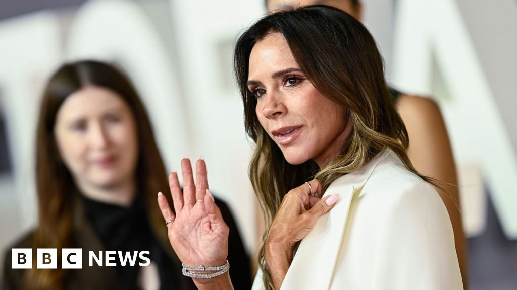 Getty Images Victoria Beckham waves while wearing a white suit with other people in the background as she attends the Victoria Beckham premiere in London on Wednesday.