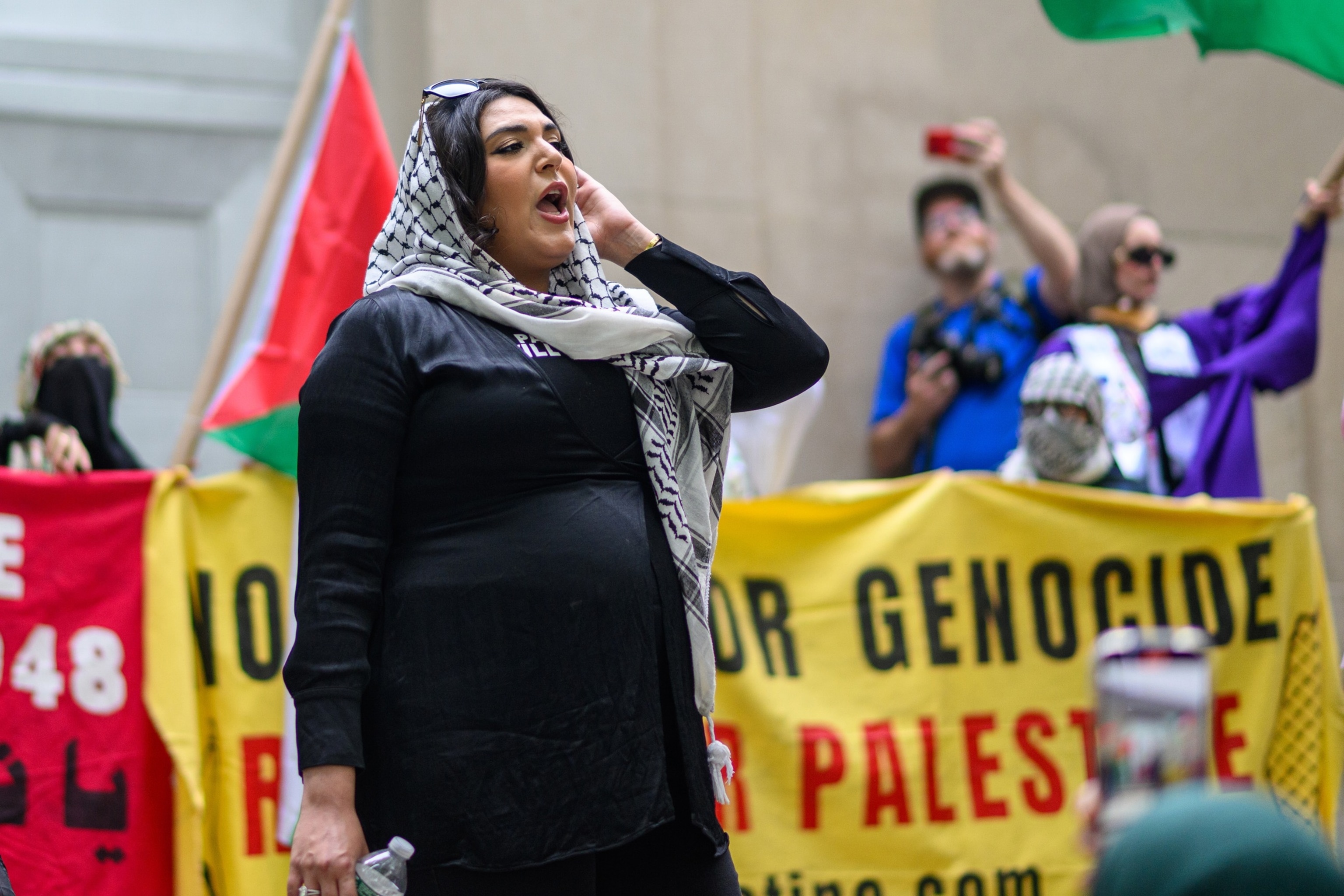 In this May 15, 2025, file photo, Nerdeen Kiswani speaks at a Nakba day protest in Brooklyn, New York.