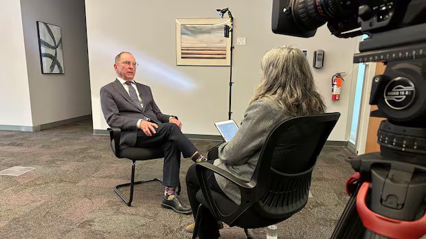 A man sitting in a chair in an office speaks with a female reporter with a TV camera in the foreground.
