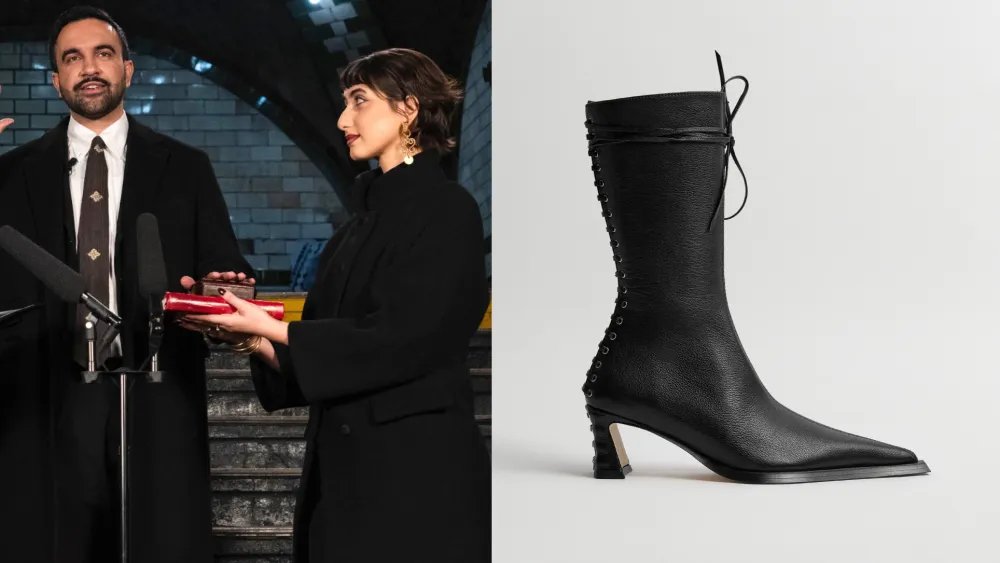 As Mamdani’s term as mayor began immediately in the new year, the couple walked into the old City Hall Station hand in hand after midnight, with her wearing a pair of Miista’s Shelley Boots. The edgy black leather boots featured a low, sculpted block two-inch heel and a striking decorative lace-up design running vertically up the back, finished with a tie at the top.