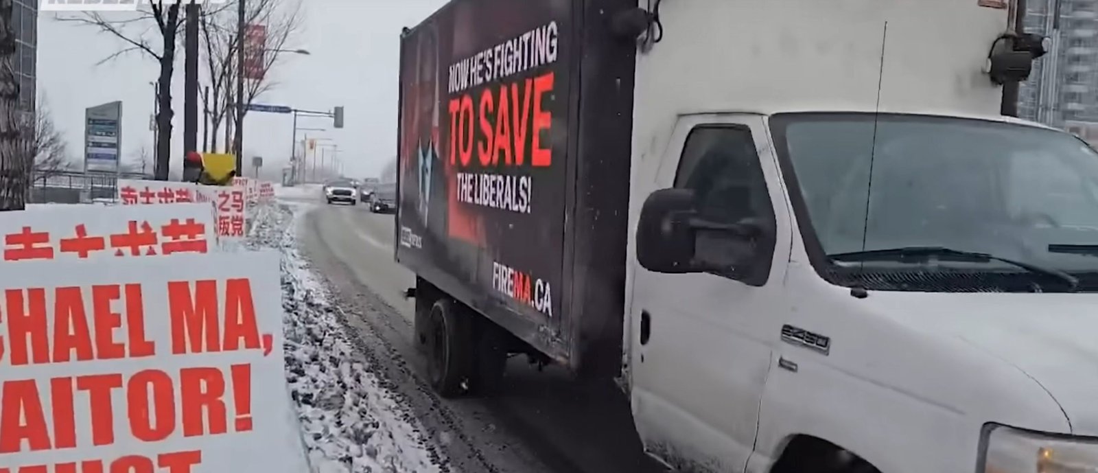 Toronto-based Rebel ‘mission specialist’ David Menzies also made his way to Markham-Unionville to chat with some of the “dozens of protesters” who staked out Ma’s office during a blustery Monday, where they were also treated to a drive-by visit by the the Rebel’s very own billboard truck to promote the newly launched FireMa petition drive.