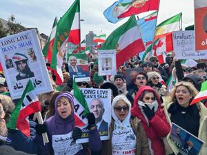 “We are here to be their voice,” said one protester at the planned rally as others cheered the news Iran’s Supreme Leader Ayatollah Ali Khameini had been killed in the airstrikes.
