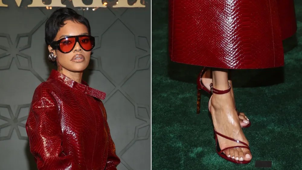 Teyana Taylor attends the grand opening of Gymkhana Las Vegas at ARIA Resort & Casino in a head-toe-toe Tom Ford look, including the label’s Patent Leather Ankle Strap Sandals in Ruby Red, on Jan. 16, 2026 in Las Vegas, Nev.
