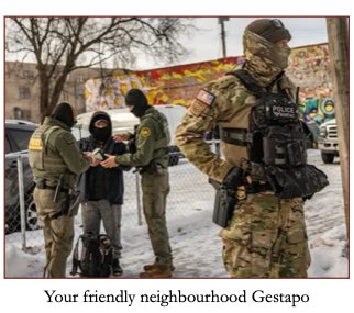 Heavily armed men tramping around your neighbourhood hunting down your neighbours would offend any civilized community. Maybe that’s the point. Maybe this is simply a blue city in a blue state being taught who’s boss. With Renee Nicole Good as collateral damage.