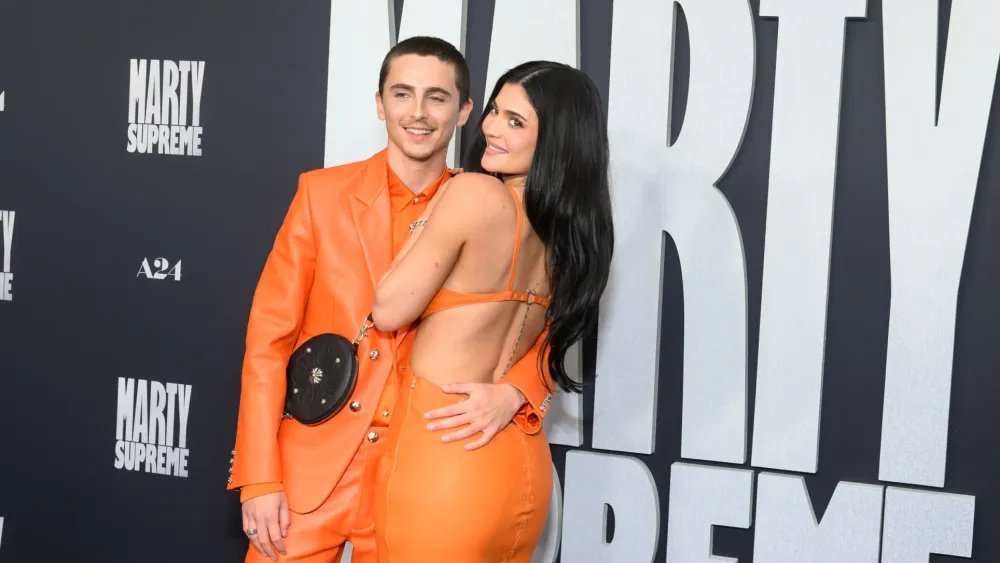 The two-time Oscar-nominated actor and Kylie Cosmetics founder wore orange apparel for the red carpet event — a color tone reference to the “Marty Supreme” table tennis (or ping pong) balls featured in the film. Jenner’s leathery dress was designed with a sensual silhouette, with formfitting fabric, cutouts at the waist beneath the bustline and a plunging neckline to boot.