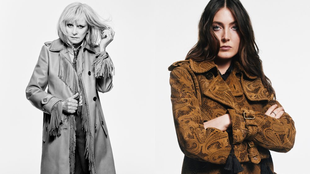 Twiggy, who attended the brand’s spring 2026 show last September at the giant tent set up at Kensington Palace Gardens, sports a leather trenchcoat with fringe in the campaign, while Wigram dons a brown paisley laser-cut suede trenchcoat with whipstitching detail.