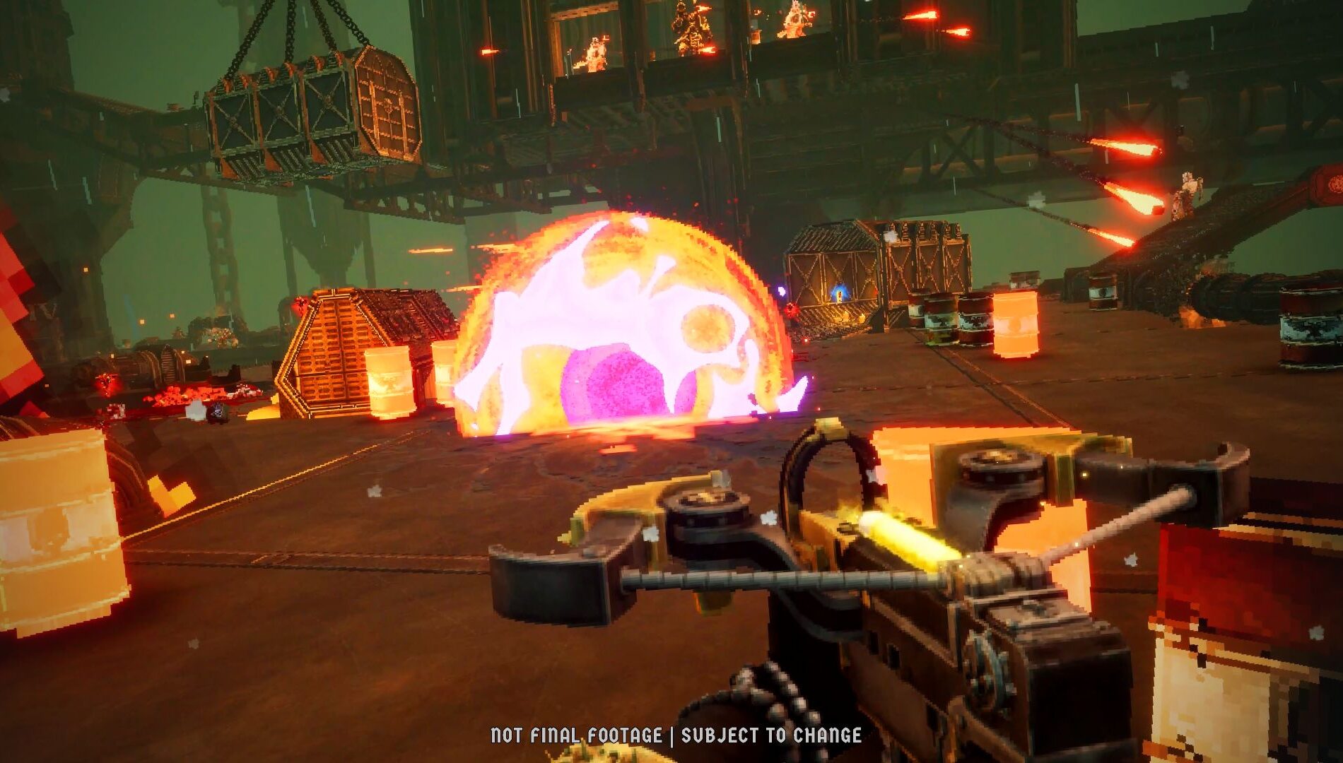 We’ve spent a lot of time during development making sure her flame-based weapons are as gratifying as possible to use. For these weapons more than most, visual and audio feedback can make or break their feel. They’ve got to be convincingly destructive – as befits a wild torrent of flame – whilst still clearly communicating to the player where and how damage is being applied. My personal favourite is the Heavy Flamer — our internal goal was to make a weapon that feels like the end of the world, and I’m very happy with (and slightly terrified by) the results.