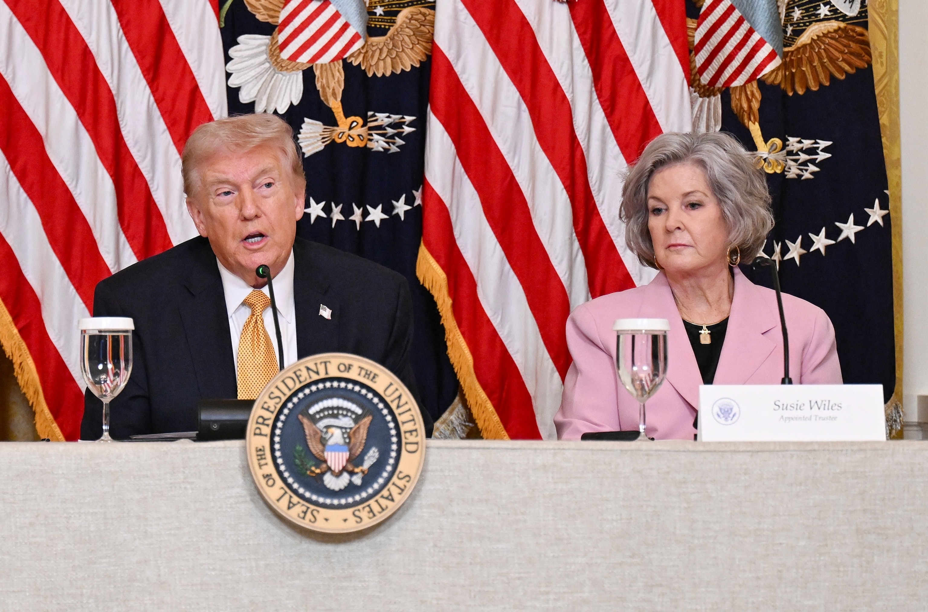 President Donald Trump joined by White House Chief of Staff Susie Wiles speaks during a lunch with the Kennedy Center Board Members in the East Room of the White House, March 16, 2026 in Washington.
