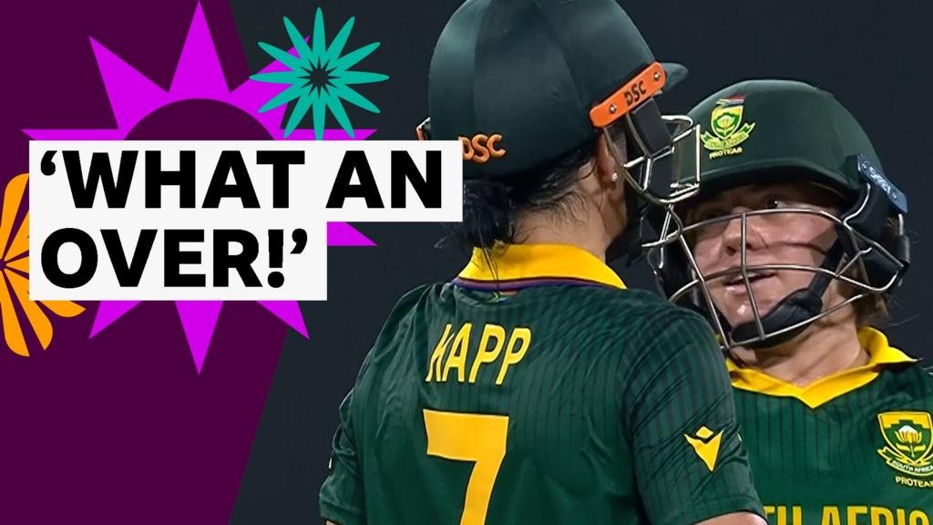 South Africa pair Nadine de Klerk and Marizanne Kapp combine to hit Pakistan’s Fatima Sana for 25 runs from six balls in the ICC Women’s Cricket World Cup.